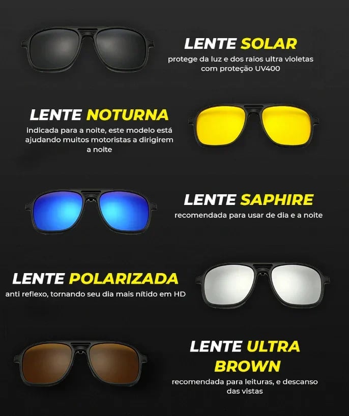 The 6 in 1 glasses brings with it with polarized lenses tested and approved by renowned doctors, ensuring full protection against ultraviolet rays, the main cause of serious and irreversible diseases in the eyes